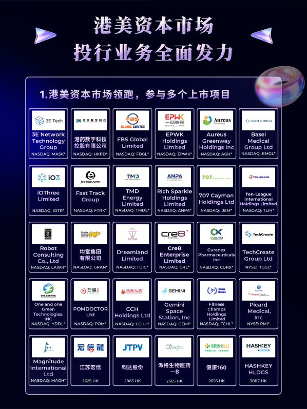 在港美IPO市场,艾德金融深度参与多个优质上市项目,覆盖科技、医疗、消费、新能源等多个热门赛道,助力企业登陆全球核心资本市场。在美股市场,艾德金融协助了包括FBS Global Limited (NASDAQ: FBGL)、EPWK Holdings Limited (NASDAQ: EPWK)、Aureus Greenway Holdings Inc (NASDAQ: AGH)在内的众多企业登陆纳斯达克或纽约证券交易所。在港股市场,亦成功助力江苏宏信(02625.HK)、钧达股份(02865.HK)、派格生物医药(02565.HK)等公司完成上市。尤其协助了HASHKEY HLDGS(03887.HK)这一重量级数字资产金融服务的开创者在港交所主板挂牌,彰显了其在连接传统金融与新兴数字资产领域的独特桥梁作用。