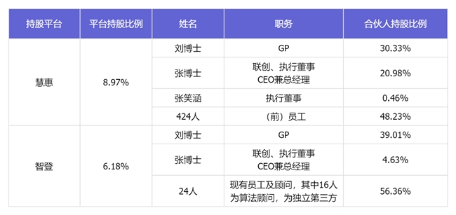 2021年,智谱搭建了员工持股平台慧惠及智登。前者承载核心员工的股权激励,后者则以算法顾问等独立三方为激励主体。刘德兵博士为二者GP,且与平台签署了一致行动人协议,控制并享有两个持股平台的股东权利。