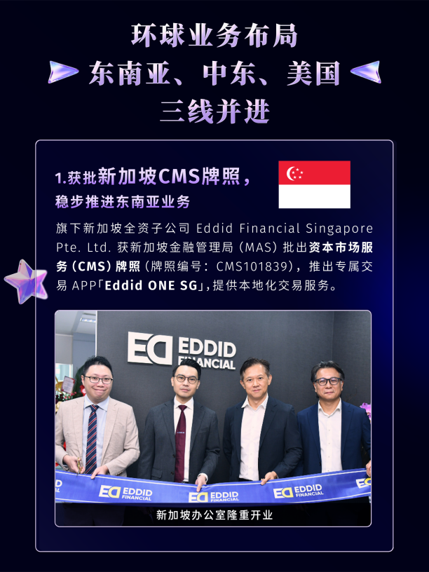 为了把握全球新兴市场机遇,艾德金融在东南亚市场以新加坡为枢纽进行深度拓展。其新加坡全资子公司 Eddid Financial Singapore Pte. Ltd. 已正式获得新加坡金融管理局颁发的资本市场服务牌照,标志着其正式进入这个重要的国际金融中心。随即推出本地化交易应用程序“Eddid ONE SG”,为当地客户提供量身定制的专业服务。